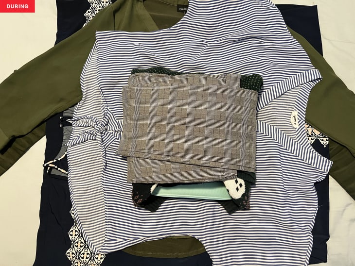 Start by placing your most wrinkle-prone clothes (like dresses, blouses, or formal shirts) in the middle of the bundle. Then, wrap softer or larger items like jumpers or trousers around them layer by layer.